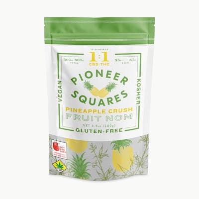 PIONEER SQUARES Pineapple Crush CBD:THC gummies are gluten-free, vegan and Kosher. Candied artisan fruit candy chew. We start with a tart pineapple candy chew and add a sweet candied pineapple slice in the middle. 50mgCBD:50mgTHC per bag, 5mgCBD:5mgTHC per gummy. Ingredients: Light Corn Syrup, Sugar, Water, Fruit Pectin, Pineapple, Baking Soda, Cannabis Extract, Pineapple Flavor (Natural Flavors, Sunflower Oil), Canola Oil, Citric Acid, Agar Agar