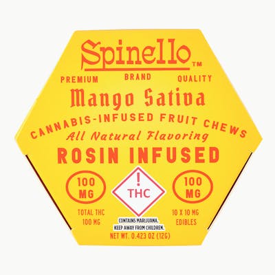 Enjoy Spinello! Served in a stay-fresh case, our delicious Mango Sativa fruit chews are infused with premium live-rosin in an easy dose, break-away gummy. Vegan, gluten-free, and made with all-natural flavors, each fruit chew contains 10mg THC per serving, with 100mg THC total per package. -- Taste the difference today.