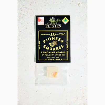PIONEER SQUARES Lemon Mandarin THC gummies are gluten-free, vegan and Kosher. Candied artisan fruit candy chew. We start with a tart lemon candy chew and add a sweet candied Mandarin slice in the middle. It's a little elevation for your mood. Enjoy! 10mgTHC per gummy. Ingredients: Light Corn Syrup, Sugar, Water, Fruit Pectin, Orange, Baking Soda, Cannabis Extract, Lemon Oil, Canola Oil, Citric Acid, Agar Agar