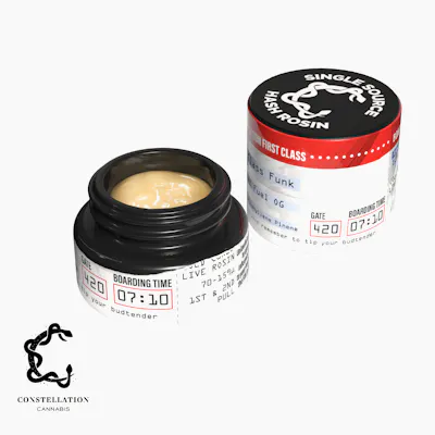 Elevate your cannabis experience with Constellation's Hash Rosin, the pinnacle of purity and potency. Crafted through a meticulous extraction process. Our solventless concentrate is created by delicately separating the trichome heads from the plant material using ice and water. Filtered through fine mesh bags, every drop of Hash Rosin is a testament to our commitment to quality. Indulge in a truly authentic and clean cannabis experience that will leave you craving for more. Say goodbye to solvents and hello to a new level of enjoyment with Hash Rosin. 1st Class Funk -- GMO x Jetfuel OG