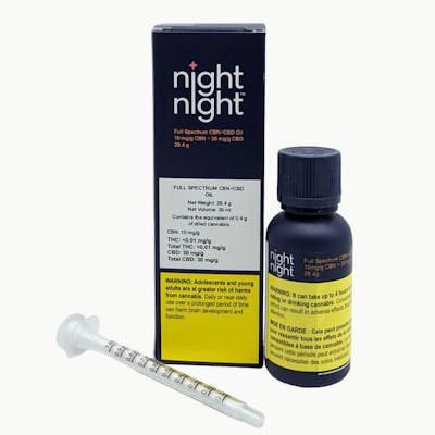 NightNight Full Spectrum CBN+CBD Oil contains 10mg CBN and 30mg CBD in a 30ml oil format. CBN and CBD extracts are blended to an optimal 1:3 ratio, diluted in MCT oil, and combined with a blend of 13 natural terpenes including Linalool, Myrcene, and Caryophyllene to create this full-spectrum oil.