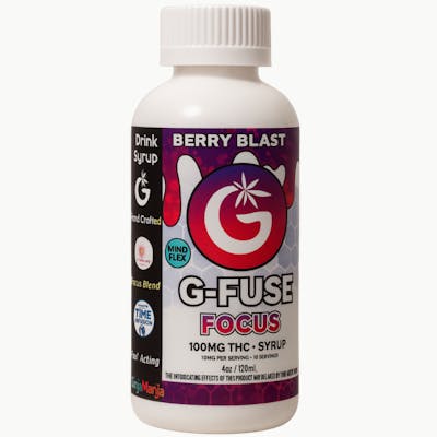 FOCUS BERRY BLAST [SATIVA] THC SYRUP - 100MG Dive into the vibrant world of G-Fuse’s Focus Berry Blast THC Syrup, a tantalizing elixir that combines premium cannabis innovation with an explosion of fruity delight. This 100MG THC-infused syrup boasts a bold medley of crushed berries, blending the sweet juiciness of blueberries, the tart zing of raspberries, and a hint of ripe strawberries for a refreshing, mouthwatering profile that's perfect for mixing into your favorite beverages or enjoying straight. Crafted with a special "Mind Flex" formula, it delivers focused effects that sharpen your mental clarity, boost recovery, and provide a balanced surge of steady energy without the jitters—ideal for powering through workouts, study sessions, or creative endeavors while maintaining a calm, centered vibe. Why wait? Elevate your routine and unlock your peak potential—grab a bottle of G-Fuse’s Focus Berry Blast today and taste the focus revolution for yourself! Ingredients: Sodium Benzoate, purified water, Natural Flavor, Pure Cane Sugar, Citric Acid, Sucralose, Organic Lion's Mane Mushroom Powder, Ashwagandha Powder, Cordyceps, Cannabis Oil. Components may have been sourced from a facility that processes Tree nuts.