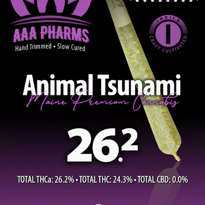 1g Pre Roll. No shake or trim. Animal Tsunami is an indica strain grown by AAA Pharms and created by crossing Animal Cookies X Caramel Tsunami.