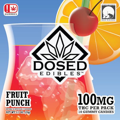 Fruit Punch 100mg THC Gummies By Dosed Edibles in Fairbanks, Alaska. Hybrid. 10 pieces 10mg each totaling 100mg.