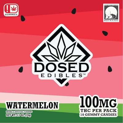 Watermelon 100mg Gummies By Dosed Edibles in Fairbanks, Alaska. 10 gummies 10mg each totaling 100mg.