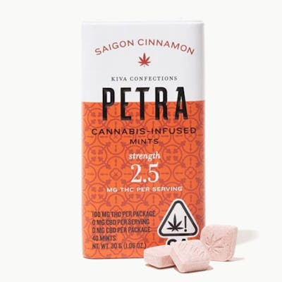 The radically refreshing mint edible that sparked a microdosing revolution. Enjoy this subtly powerful 40-Pack of saigon cinnamon flavored poppable treats. Each mint contains just 2.5MG of THC per serving, making it easy to find your optimal dose and enhance any and every experience. The potential effects of Petra Mints are personal, as it is a distillate based edible. This means dosage and effect can vary based off of how your body usually responds to THC alone! (AKA, without other cannabinoids or terpenes).