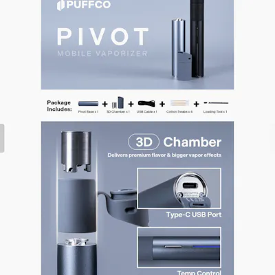 The Pivot puts the full Puffco experience in your pocket. The same size as a pen, this discreet, mobile vaporizer features a quick-release 3D Chamber that delivers premium flavor and real-time temperature control. With a light bar that serves as a visual dab timer, haptic feedback, a single-button interface, and four dialed heat presets, the Pivot is a true dab you can take anywhere. Low profile. High performance. *This Product is Not For Use With Tobacco, Nicotine-Containing E-liquids, or Any Synthetic Nicotine or Nicotine Substitute. Included: Pivot (Base, Chamber, Mouthpiece), Cotton Swabs, Loading Tool, USB-C Cable