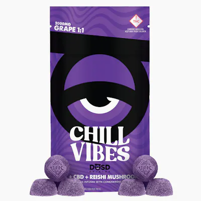 CHILL VIBES Nano Bites - Grape Flavored Gummies infused with Water-Soluble THC & CBD Nanoparticles + Reishi Mushrooms Average Onset: 15-25 minutes Pieces per package: 20 x 100mg pieces (100mg THC + 100mg CBD + 25mg Reishi per piece) What are Nanoparticles? Our CHILL VIBES Nano Bites contain cannabinoid nanoparticles made from ultra-refined distillate, which are utilized by the body much more efficiently than unrefined oils. With increased bioavailability of THC & CBD, you can expect more out of your dose...with far less waiting. #AreYouDOSD