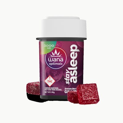 NEW! High Dose Optimals Stay Asleep Indica Per Package: 3000mg Per Piece: 50mg THC, 50 mg CBN, 50mg CBG (20 Pieces Total) Calibrated ratio promotes relief from stress, discomfort, and sleeplessness with minimal grogginess. Wana’s #1 best seller, now in a high-dose formula!