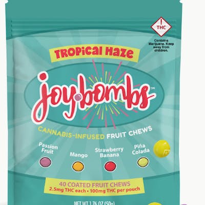 Tropical Haze (100mg THC) Take your tastebuds to the tropics with Tropical Haze Joy Bombs Candy-Coated Fruit Chews! Includes a mouth-watering mix of fruit flavors: Passion Fruit, Mango, Strawberry Banana, & Piña Colada! Joy Bombs’ signature sugary shell means they'll melt in your mind, but not in your car, purse, or pocket. They're perfect for easy snacking and sharing. Joy Bombs are purposefully dosed to help you dial in or stack the milligrams and effects that you want! With 2.5mg THC in each bite-sized piece, you can micro-dose for days or nom the whole pouch for a 100mg adventure! Dietary Info: Gluten Free & Vegan. Contains Soy.
