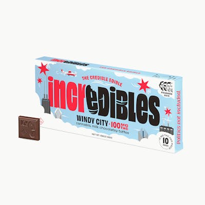 -- Politics not included. Blow those worries away with this Illinois classic. Buttery toffee and pure, milk chocolatey joy. incredibles Windy City bar offers 100mg THC total, with 10mg THC per square. Made with 100% pure cannabis oil in a perfectly blended mixture to ensure accurate dosing and consistency.