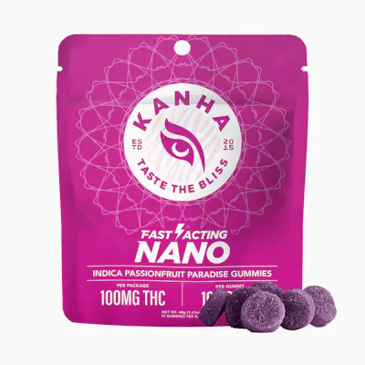 10 pieces x 10mg/gummy = 100mg/bag -- An exotic South American gem, passion fruit tastes like a refreshing wave of tropical goodness. Pairing the tangy citrus flavor with premium indica oil and terpenes like myrcene and α-humulene, Passionfruit Paradise Indica offers better absorption and faster onset times thanks to our exclusive NANO technology. KANHA, the first to introduce fast-acting effects, remains the industry leader with NANO gummies.