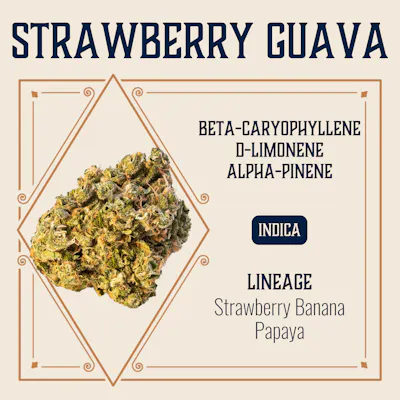Lineage: Strawberry Banana x Papaya A tropical heavyweight with sweet fruit flavor and heavy effects, Strawberry Guava (Strawberry Banana × Papaya) brings the best of both parents. The smoke is smooth and candy-like, with tropical berry notes and a mellow citrus lift. Expect a relaxed, happy high with a side of munchies—perfect for winding down or easing stress without totally checking out. A tropical heavyweight with sweet fruit flavor and heavy effects, Strawberry Guava (Strawberry Banana × Papaya) brings the best of both parents. The smoke is smooth and candy-like, with tropical berry notes and a mellow citrus lift. Expect a relaxed, happy high with a side of munchies. Flavors: Fruity, Sweet, Citrus