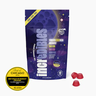 -- Head to the Snoozzzier side of the moon with this spin on our incredibles original for an even sweeter slumber. incredibles Snoozzzierberry gummies offer 100mg THC, 50mg CBN and 50mg CBG total with 10mg THC, 5mg CBN and 5mg CBG per piece. Made with 100% pure cannabis oil in a perfectly blended mixture to ensure accurate dosing and consistency.