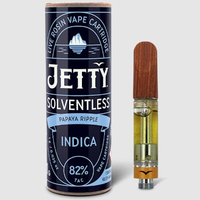 Papaya Ripple delivers a blissful body high that perfectly balances euphoria with deep relaxation. Its fruity, sugary sweetness is enhanced by a peppery, herbal twist, making it a flavorful treat for a calming experience. Jetty Solventless is the most-awarded vape since 2020. It is the cleanest oil available, made from cold water hash that’s extracted using only ice and water. Our unique filtration process removes excess fats and waxes increasing purity (and THC %) while keeping all the tasty terpenes. The result: a light, golden oil and an unmatched flavor profile. Look for the Jetty signature wood tip and our premium cartridges which work with any 510-thread battery.