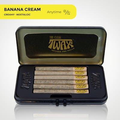 TWAX Infused Pre-roll 3g Multipack (.5g X 6) | Banana Cream Anytime – Creamy, Nostalgic Satisfy your sweet tooth with our Banana Cream TWAX infused pre-roll. This creamy, nostalgic flavor combines the rich taste of ripened bananas with a hint of vanilla cream, creating a smooth and indulgent experience. It's a versatile addition to your favorites, great for use anytime. Each infused pre-roll contains one (3g) gram of premium flower, infused with distillate and kief wrapped in dye-free, unbleached paper. We take pride in offering our consumers whole, premium flower infusion ensuring a slow and even burn, every time.