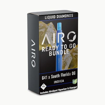 LINEAGE: G41 x South Florida OG TERPENES: *results may vary by batch* DAY SUPPLY: 2 Enjoy the future of cannabis vaporization with Airo's unique Liquid Diamonds, a luxurious cannabis concentrate with unmatched purity and maximum potency. Crafted with refined hydrocarbon extracted cannabis oil and the highest quality HTE (High Terpene Extract), this terpene-rich oil is in a league of its own. The Airo Liquid Diamonds collection offers a premium, full spectrum experience from start to finish. G41 x South Florida OG, a cross of Indica strains, offers our signature Airo quality loaded with b-Caryophyllene, Linalool and Limonene. Kick off your Airo journey with the ultimate all-in-one setup - the Ready-To-Go bundle. Includes 1g AiroPod Liquid Diamond cartridge, 1 AiroSport vaporizer & 1 charging cord - everything you need to elevate your experience, right out of the box.