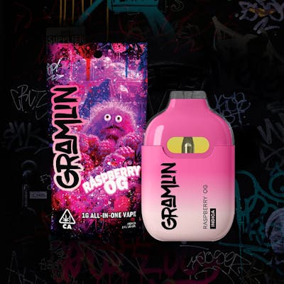 This full gram All-In-One Vape is ready to smoke out of the bag. With bright razz flavors and hints of gas, this Raspberry OG indica vape's quality ceramic coil and filter tech mean big flavor and bigger clouds. The inhale-activated LED blinks 2x for heat-protection or 10x for low battery. USB Type-C recharbeable cord not included. No buttons, no fuss, just rip to unlock Gramlin Mode. @gramlinmode | gramlinmode.com
