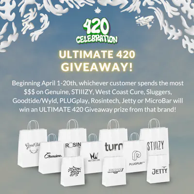 Entries valid from April 1st - April 20th. Winners will be announced shortly after 4/20, and contacted to claim their prize. Participating brands are: Genuine, STIIIZY, West Coast Cure, Sluggers, Goodtide/Wyld, PLUGplay, Rosintech, Jetty and MicroBar. Call Us for Details at 714-836-5576.