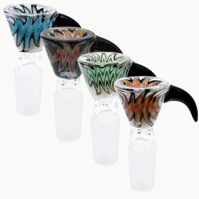 A vibrant 14mm bowl featuring bold wig wag linework and a hooked handle for easy gripping and pulling. Each piece shows off colourful swirling patterns that stand out on any setup. Available in assorted designs so every bowl has its own unique look.