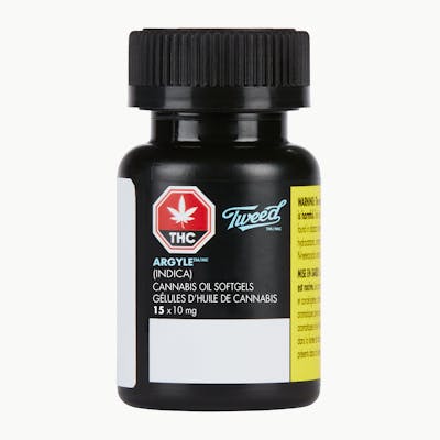 Argyle is a variety of Nordle grown by Canadian LP Tweed, Inc. The indica-dominant hybrid crosses Afghani and Sensi Star genetics. The resulting buds smell of garlic and herbs, like fresh cut chives but with a fruity aftertaste. With a 1:1 ratio of THC to CBD Argyle creates a mellow, calming buzz that is a great answer to body pains and muscle spasms. Tweed Argyle 1:1 CBD:THC 15 x 10mg Capsules THC/Capsule: 10mg THC Total: 150mg CBD/Capsule: 10mg CBD Total: 150mg