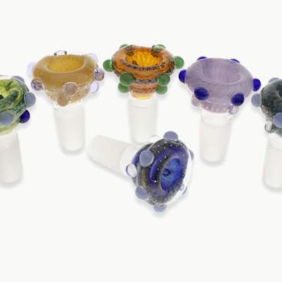 A beautiful crafted glass bowl. This bowl features a deep pocket for dry-herb. The colours compliment eachother with different beads to contrast the main colour of the bowl. 14mm and various colours available.