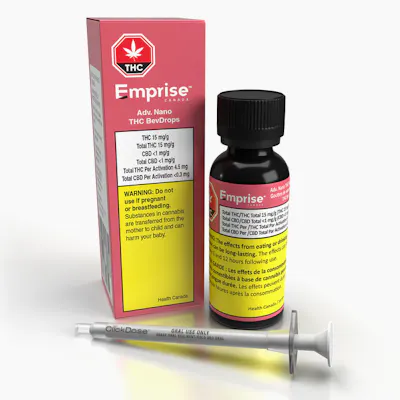 Emprise's Adv. Nano THC BevDrops deliver a 15 mg/g THC-dominant product in water-soluble format. The product is formulated to be added to a beverage for rapid onset within 8-12 minutes. Each bottle contains 30 g of emulsion (450 mg THC). A syringe with 0.3 ml capacity is also included. One syringe dose delivers 4.5 mg THC. This is the most advanced formulation of Nano on the market. Perfected over 3 years of R&D to dissolve instantly in any beverage for a Colorless, Odorless, and Tasteless THC infuser in your favorite flavored beverage. The future of THC consumption is here.