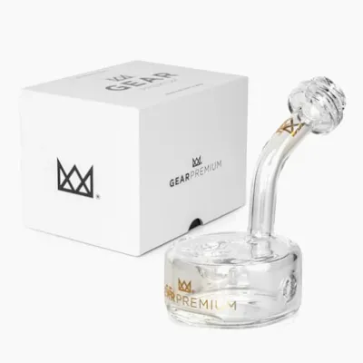 The Logan Puck Hand Pipe from GEAR Premium® is a refreshing interpretation of a classic hand pipe design. The pipe chamber allows the smoke to cool and expand before entering the extended mouthpiece, while the raised carb hole gives you complete control of your airflow for a smooth pull with every bowl. 100% borosilicate glass 24K gold decal Extended mouthpiece Raised carb hole