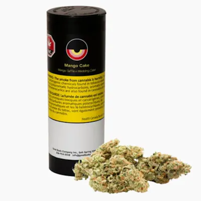 Bred in-house, our Mango Cake is an exotic dessert cross of GOOD BUDS' juicy Mango Taffie cultivar with sweet and creamy Wedding Cake. It leads with classic Mango Taffie smells of ripe mango sweetness with a gassy afterburn, followed by sweet vanilla undertones and a creamy mouthfeel on the exhale. Grown in small batches in living organic soils, each batch of Mango Cake is hand-harvested, hang-dried, and slow cured following artisanal legacy methods. It's then hand-packed into recyclable EcoLite tubes, which use 50% less plastic than average tubes. Terpenes include terpinolene, ocimene, and myrcene.