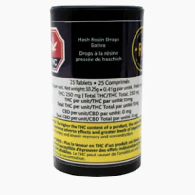 Hash Rosin Drops Sativa are solventless, strain specific, and high dosage. 10mg x 25-piece format is ideal for daily usage. Vegan and gelatin-free with no sugar, or sugar substitutes, and a clean ingredient list.