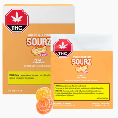 SOURZ by Spinach® Fully Blasted Peach Orange 1:1 CBD | THC Gummies are action-packed with a balanced blend of 10mg THC and 10mg CBD per piece. With the taste of sweet peach and juicy orange, these dual-flavoured gummies are over-the-top with natural flavours and blasted with sour crystals. Enjoy 10 gummies with 10mg THC and 10mg CBD per gummy, 100mg THC total and 100mg CBD total per pack.