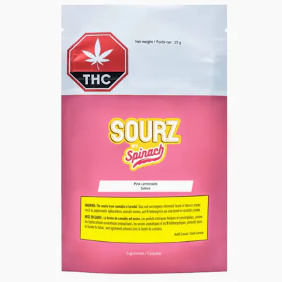 It always tastes like summertime with Pink Lemonade SOURZ by Spinach. With sweet raspberry and refreshing lemonade flavours, this dual-flavoured soft chew blasted with sour crystals is over-the-top with natural flavours. Five pieces per pack with 10mg THC total.