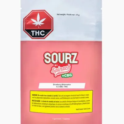 Sink your teeth into a juicy combination of strawberry and refreshing watermelon flavours with SOURZ by Spinach Strawberry Watermelon 4:1 CBG|THC gummies. With 8mg CBG and 2mg THC per gummy. These dual- flavoured gummies blasted with sour crystals are over-the-top with natural flavours. Enjoy five gummies per pack and 40mg CBG total and 10mg THC total.