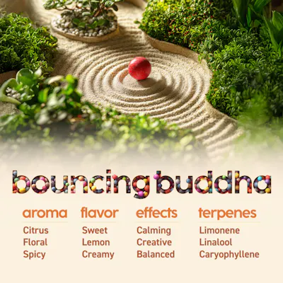 Center yourself, then bounce right back. Bouncing Buddha is a hybrid that blends zesty citrus, floral spice, and creamy lemon sweetness into one smooth and flavorful hit. Born from Rainbow Belts crossed with Superboof #2, it delivers creative calm and balanced clarity, making it easy to stay grounded while your mind explores.