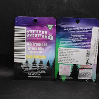Northern Connections sugar-free drink mixes are cannabis-infused drink powders containing THC. They are available in various flavors and are designed to be mixed with water. Key features Cannabis-infused: The drink mixes typically contain 50mg of THC per packet. Faster activation: Compared to traditional edibles, these drinks are known for having a faster activation time. Flavors: Available varieties include: Margarita Pina Colada Caribbean Fruit Punch Strawberry Daiquiri High Cappuccino French Vanilla