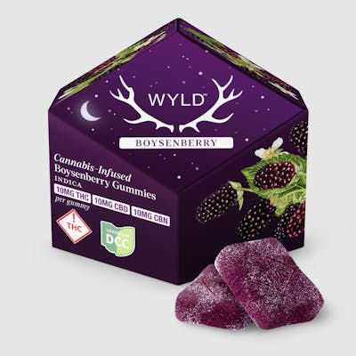 About the Product: Real-Fruit Cannabis Infused Gummies Wyld Boysenberry’s 1:1:1 combination of THC, CBD, and CBN work together to soothe body and mind, making it the ideal blend for those seeking a deeper rest. 10mg THC:10mg CBD:10mg CBN per gummy; 100mg THC:100mg CBD:100mg CBN per package Ingredients: Sugar, Tapioca Syrup, Water, Boysenberry Juice Blend (Blackberry Juice Concentrate, Raspberry Juice Concentrate, Boysenberry Juice Concentrate), Gelatin, Natural Flavoring, Malic Acid, Coconut Oil, Citric Acid, Pectin (Pectin, Sodium Citrate), Hemp Extract, Cannabis Extract, Sunflower Lecithin Contains: Coconut