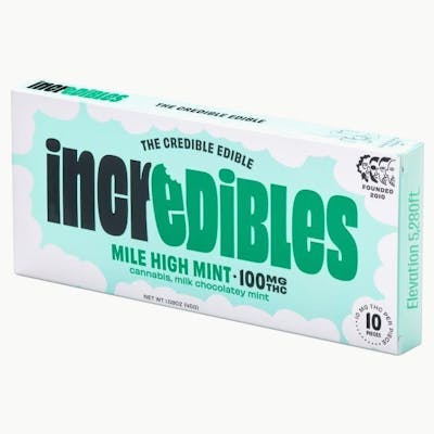 Reach peak elevation with this Incredibles original. Cool mint, milk chocolatey good times. Incredibles Mile High Mint bar offers around 100mg THC total, with 10mg THC per square. Made with pure THC distillate in a homogeneous mixture to ensure accurate dosing and consistency.