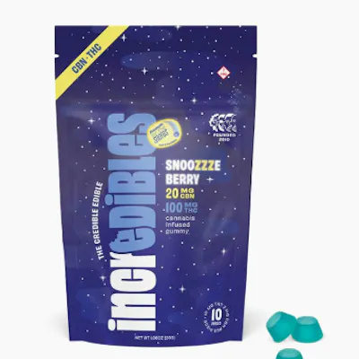 Reach for the snores. Twinkling starlight, blueberry comets, and a date night with your pillow. Sweet dreams. Snoozzzeberry gummies offer 100mg THC and 20mg CBN total, with 10mg THC and 2mg CBN per gummy. Made with 100% pure cannabis oil in a perfectly blended mixture to ensure accurate dosing and consistency. -- Featuring a precision-dosed confection collection with yummy flavors, delicious effects and FDA-approved ingredients, you can trust incredibles to be the credible edible. -- Potential effects: Promotes restful sleep -- Serving size: Standard serving is a single gummy (10mg THC and 2mg CBN). Bag contains ten gummies for a total of 100mg THC and 20mg CBN. -- Onset & duration: Onset may take up to 2 hours. Duration can last up to 3+ hours. Effects vary by individual. Estimates are based on a standard serving. -- Contents: Made with pure THC oil and evenly blended for consistency. - -- Allergens: Coconut oil. Made in a facility that processes tree nuts, peanuts, milk, soy, and wheat. -- Ingredients: Glucose, sugar, gelatin, sorbitol, potato starch, citric acid, spirulina extract (color), coconut oil, blueberry flavor, cannabis extract, natural flavors, hemp-derived extract, carnauba wax -- Storage: Keep in original sealed container between 60°F - 80°F. Avoid conditions of high humidity and temperature. Keep out of direct light and do not store in hot car.