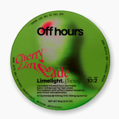Off Hours cherry limeade flavored gummies are formulated with a specialized combination of THC, CBG, and added CBD to provide you a focused and clarifying high. Nano-enhanced cannabinoids for fast onset. Vegan friendly and gluten free. Flavor: Cherry Limeade (Sour) Terpenes: special blend for focus Size: 10ctStrength: 100mg THC (10mg/serving) +20mg CBG (2mg/serving) Suggested use: start with 1/2 of a gummy. Wait 1full hour before increasing dose. Ingredients: organic cane sugar, reverse osmosis water, organic tapioca syrup, organic fruit juice from concentrate, fruit pectin, organic fruit flavoring, natural food coloring, MCT oil, cannabis extract, soy extract, terpenes, malic acid