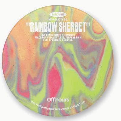 FLAVOR: Rainbow Sherbet SIZE: 10CT STRENGTH: 100MG THC (10MG/SERVING) Mellow out with Off Hours Nevada City OG “Rainbow Sherbet” Live Rosin gummies. These sweet, summery gummies pair savory Nevada City OG rosin with nostalgic fruity notes of Rainbow Sherbet for a relaxing, soak-up-the-sun high. SUGGESTED USE: Start with 1/2 of a gummy. Wait 1 full hour before increasing dose. INGREDIENTS: Organic Cane Sugar, Reverse Osmosis Water, Organic Tapioca Syrup, Organic Fruit Juice from Concentrate, Fruit Pectin, Organic Fruit Flavoring, Natural Food Coloring, MCT Oil, Cannabis Extract, Malic Acid, Sunflower Lecithin