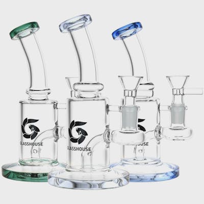 The Bent Neck Glass Water Pipe from Glass House features a rig-style pipe body with a fixed downstem. These quality borosilicate glass water pipes have an angled mouthpiece and a Glass House logo on the exterior. Measures 6.75 inches (17.1cm) tall. Includes 14mm male herb slide with a handle.