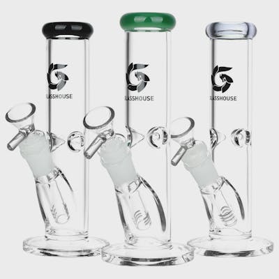 The Pinched Straight Tube Glass Water Pipe from Glass House features a straight pipe body with a slitted downstem diffuser and a funnel style herb slide with a handle. These durable borosilicate glass water pipes have a Glass House logo on the exterior and a 3 pinch ice catcher in the neck for rapidly cooling smoke. Measures 7.75 inches (19.7cm) tall.