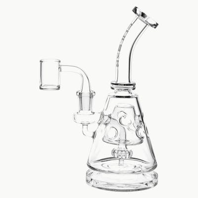 The Pulsar Bent Neck Pyramid Glass Dab Rig measures 8 inches (20.3cm) tall and is crafted with a slitted disc percolator and a fab egg diffuser with a conical shape to match the perc chamber. Made from borosilicate glass, the water pipe has an angled mouthpiece, a wide, stable base, and a Pulsar logo on the neck. Includes a 14mm male flat top quartz banger.