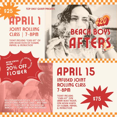 April 1: Traditional Joint Rolling How-to. Learn how to roll a jay after hours at Beach Boys! This low-pressure class is guaranteed to be a fun time! The plan is to have me (Elizabeth) give you some tips and assistance in rolling the perfect(ish) joint! With the purchase of a $25 ticket, you will recieve an 1/8th of BB house flower to roll up along with papers, my guidance for the duration of the class and a lighter of course!