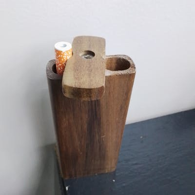 Wooden set, has area to put your flower in, comes with a one hitter and a tool to clean you one hitter