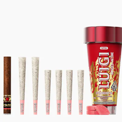 LUIGI Strawberry OG 4-In-1 Fattone delivers a premium infused preroll experience wrapped in a smooth blunt wrap for maximum enjoyment. This convenient 4-in-1 format features potent Strawberry OG, a beloved strain known for its sweet berry aroma with earthy undertones and uplifting effects. Each infused preroll combines quality flower enhanced with concentrated cannabis for elevated potency and prolonged satisfaction. Perfect for sharing or extended sessions, this Fattone offers relaxed euphoria and happy vibes that melt away stress. The blunt wrap adds a rich, aromatic smoke that complements the strawberry-forward flavor profile beautifully. Whether you're unwinding after a long day or socializing with friends, LUIGI's Strawberry OG 4-In-1 Fattone brings convenient, flavorful relief in one ready-to-enjoy package.