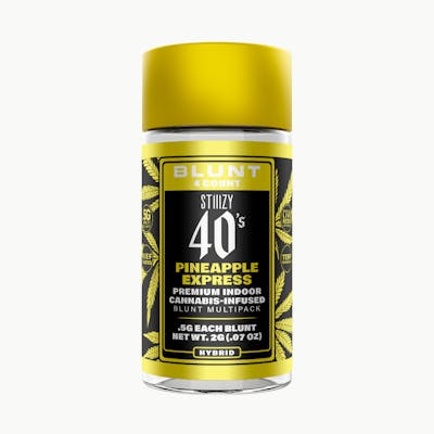BetaCaryophyllene: 12.31mg/g | BetaMyrcene: 3.21mg/g | Humulene: 5.47mg/g | THC: 30.56% -- STIIIZY 40's Mini Blunts Multipack is filled with premium grown STIIIZY cannabis and packed in individual glass vials to maintain freshness and potency. Each 40's Mini Blunt is rolled with 100% tobacco free, kief dusted hemp wraps which packs a flavorful and potent punch with every exhale, and the tightly secured tips have been perfected to provide an amazing and consistent burn every time. The STIIIZY 40's Mini Blunts Multipack is reinventing your high experience by being one of the first to introduce 40% THC and total cannabinoids potency with special live resin infusion. PINEAPPLE EXPRESS