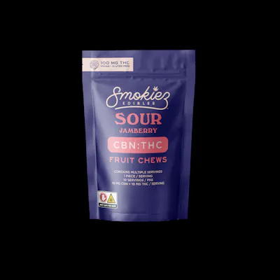 Smokiez Sour Jamberry CBN:THC 1:1 Fruit Chews - CBN | SLEEP Smokiez Sour Jamberry CBN:THC 1:1 Fruit Chews are NOT YOUR AVERAGE FRUIT CHEWS™ ;) These delicious fruit chews are a tasty and discreet way for you to medicate! They are also Vegan, Gluten Free, Dairy-Free, and contain NO High Fructose Corn Syrup. Each of our mouth watering fruit chews contain 10 mg of CBN and 10 mg of THC, and are made with our high clarity cannabis distillate for great taste. There are 10 pieces per package with 100mg CBN + 100 mg active THC per package. SO... WHAT IS CBN? Cannabidol (CBN) is the most sedative-known cannabinoid, making it ideal for a good night's sleep.