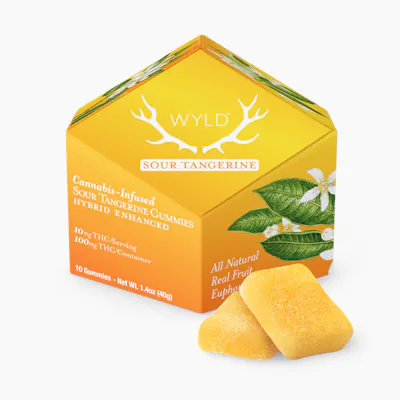 Wyld’s Sour Tangerine Hybrid Enhanced gummies are made with real fruit and enhanced with botanical terpenes that assist in creating both euphoric and playful experiences, with a tart, punchy twist. Euphoric & Playful | Perfect for carefree adventures --- 100mg THC per package, 10mg THC per gummy --- Ingredients: Sugar, Tapioca Syrup, Water, Tangerine Juice Concentrate, Gelatin, Malic Acid, Coconut Oil, Natural Flavoring, Citric Acid, Pectin (Pectin, Soduim Citrate), Cannabis Extract, Sunflower Lecithin Contains: Coconut