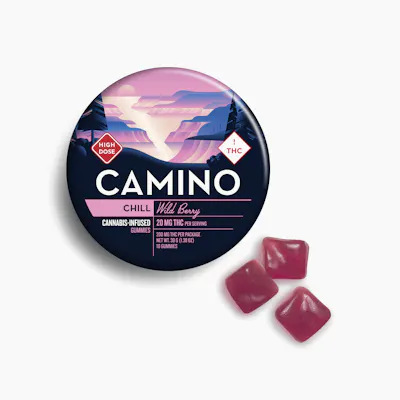 20mg THC per piece | 200mg THC total in 10 pieces -- EFFECT: Chill (Indica) -- Take the high road to relaxation with Camino Wild Berry High Dose gummies. This deeply chill, indica-like vibe is courtesy of our thoughtfully curated blend of THC and these plant-based terpenes: Beta-Caryophyllene, Linalool, Myrcene, Humulene, Terpinolene -- INGREDIENTS: Organic Tapioca Syrup, Sugar. Gelatin, Malic Acid, Natural Flavors, Citric Acid, Cannabis Extract, Fruit and Vegetable Juice for Color, Natural Terpenes, Coconut Oil, Carnauba Wax